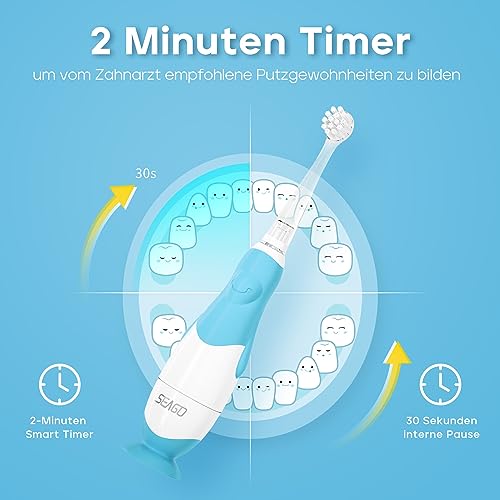 Pulizia efficace e delicata: pulizia oscillante fino a 16000 volte al minuto, le vibrazioni delicate rimuovono la placca meglio di uno spazzolino manuale convenzionale. Lo spazzolino elettrico seago per bambini rimuove efficacemente il tartaro
