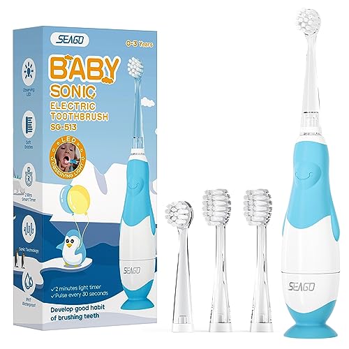 Spazzolini Bambini,Seago Spazzolino Elettrico Per Bambini,Impermeabile,Timer Intelligente,Luci a LED e 2 Testine,Spazzolino da Viaggio a Batteria,Regalo Per Bambini SG513,Blu