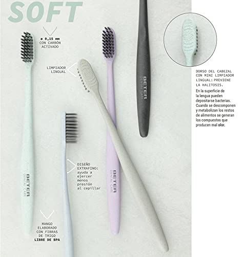 Filamenti in PBT (0,15 mm) con carbone attivo: contribuisce in modo naturale all'igiene della cavità orale e a donare ai denti un tocco delicato. Il PBT è un tipo di poliestere più rigido del nylon, di maggiore durata e resistenza