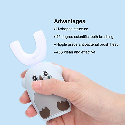 ★ DESIGN A FORMA DI U: Adotta un design impermeabile e sigillato a tutto tondo, IPX7 impermeabile, comodo, resistente e pulito. Il design dello spazzolino da denti a forma di U, utilizzando morbido materiale in silicone antibatterico per alimenti, sicuro, protegge la delicata pelle orale del bambino.