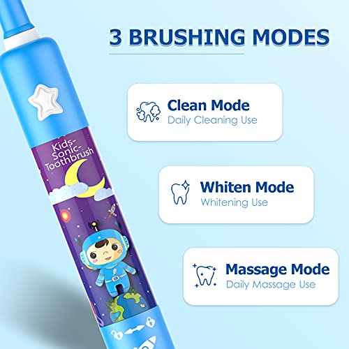 Spazzolino Elettrico Musicale per Bambini, Spazzolino Intelligente Ricaricabile per Bambini da 3 a 12 Anni Con Timer di 2 Minuti, 3 Modalità, 4 Testine (Blu)