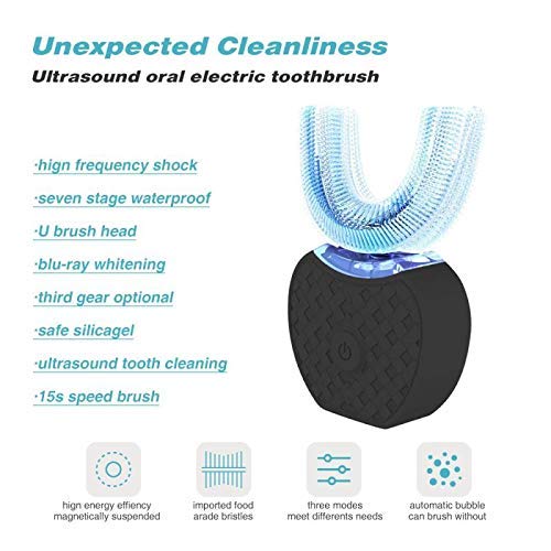 Spazzolino elettrico ad ultrasuoni, spazzolino elettrico a 360°, completamente automatico, a ultrasuoni, impermeabile, IPX7, funzione di memoria automatica, Blu-ray, sbiancamento senza fili (nero)