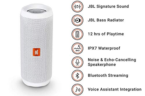 JBL Flip 4 Speaker Bluetooth Portatile, Cassa Altoparlante Bluetooth Waterproof IPX7, Con Microfono, JBL Connect+ e Bass Radiator, Compatibile con Siri e Google, Fino a 12h di Autonomia, Bianco