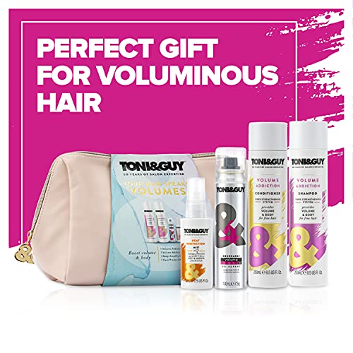 Toni&Guy Your Hair Speaks Volumes, set regalo Boost Volume Shampoo, Balsamo, Spray per capelli e Spray termoresistente con borsa per il trucco rosa