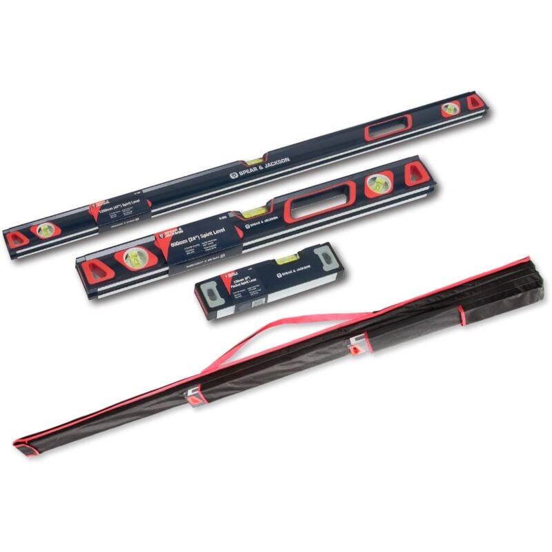 Set di 3 livelle a bolla con borsa a tracolla su misura. Include 3 livelli: 1200 mm, 600 mm e 230 mm, tutti hanno un corpo leggero ma resistente in alluminio con fiale super trasparenti, nonché manici morbidi antiscivolo. Pratica borsa a tracolla per un facile trasporto e conservazione.