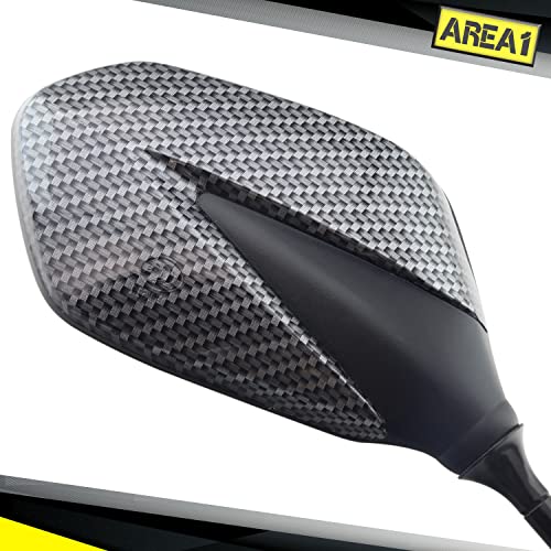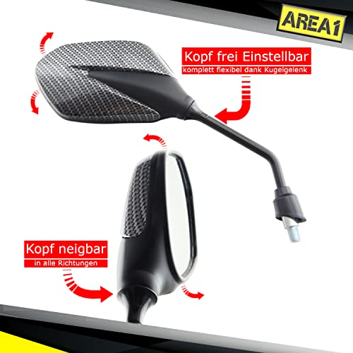 Design moderno e sportivo. Testa dello specchio in plastica di alta qualità con finitura in "effetto carbonio real". Braccio specchio in acciaio verniciato con scritta Area1 Ideale come ricambio originale o per valorizzazione estetica. Lavorazione stabile e di alta qualità. Il giunto sferico nella testa dello specchio consente molte possibilità di regolazione.