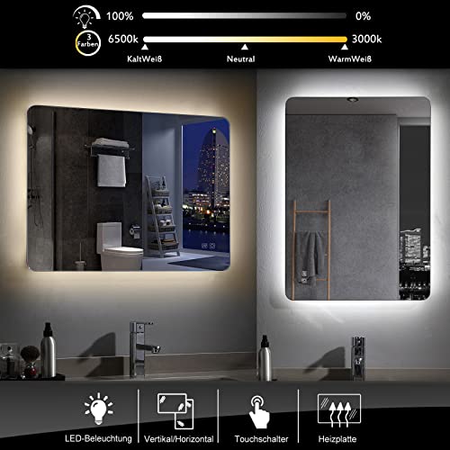 MIQU - Specchio da bagno a LED con illuminazione, bianco freddo, da parete, con interruttore touch, 80x60cm, anti-appannamento, a risparmio energetico IP44