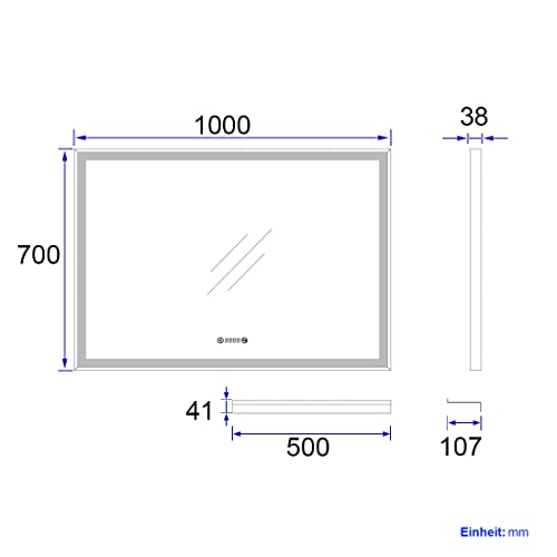 【Dimensioni specchio da bagno】Specchio da bagno rettangolare 100 x 70 cm, montaggio orizzontale, specchio da bagno a LED con cornice nera, luce neutra 4300K