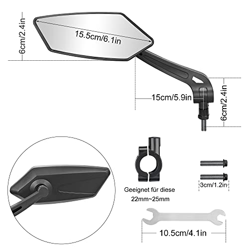 【Misura universale】 Il manubrio della bici a specchio si adatta a un diametro del manubrio da 22 a 25 mm. Ciò consente di utilizzare lo specchietto per bici da manubrio su quasi tutte le bici/scooter elettrici/e-bike, consentendoti di utilizzarlo in tutte le situazioni di cui hai bisogno.