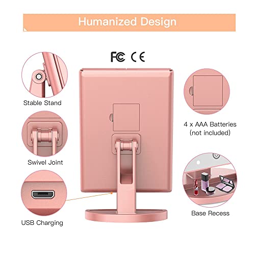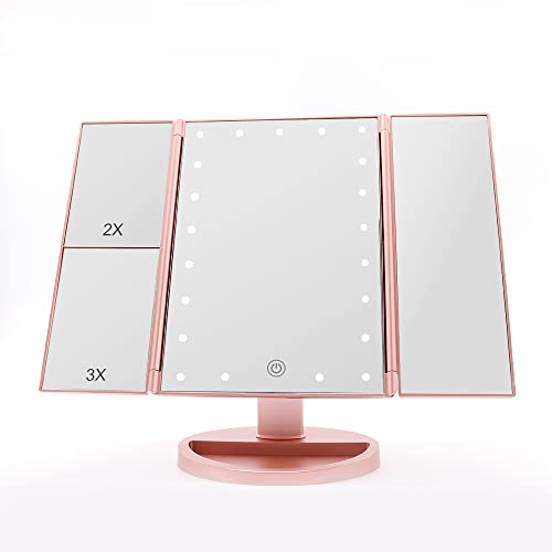 Specchio cosmetico illuminato a tre ante con 21 luci LED, touch screen oscurabile e ingrandimento 1X/2X/3X, specchio cosmetico da tavolo, specchio per trucco da viaggio, regalo per signora (oro rosa)