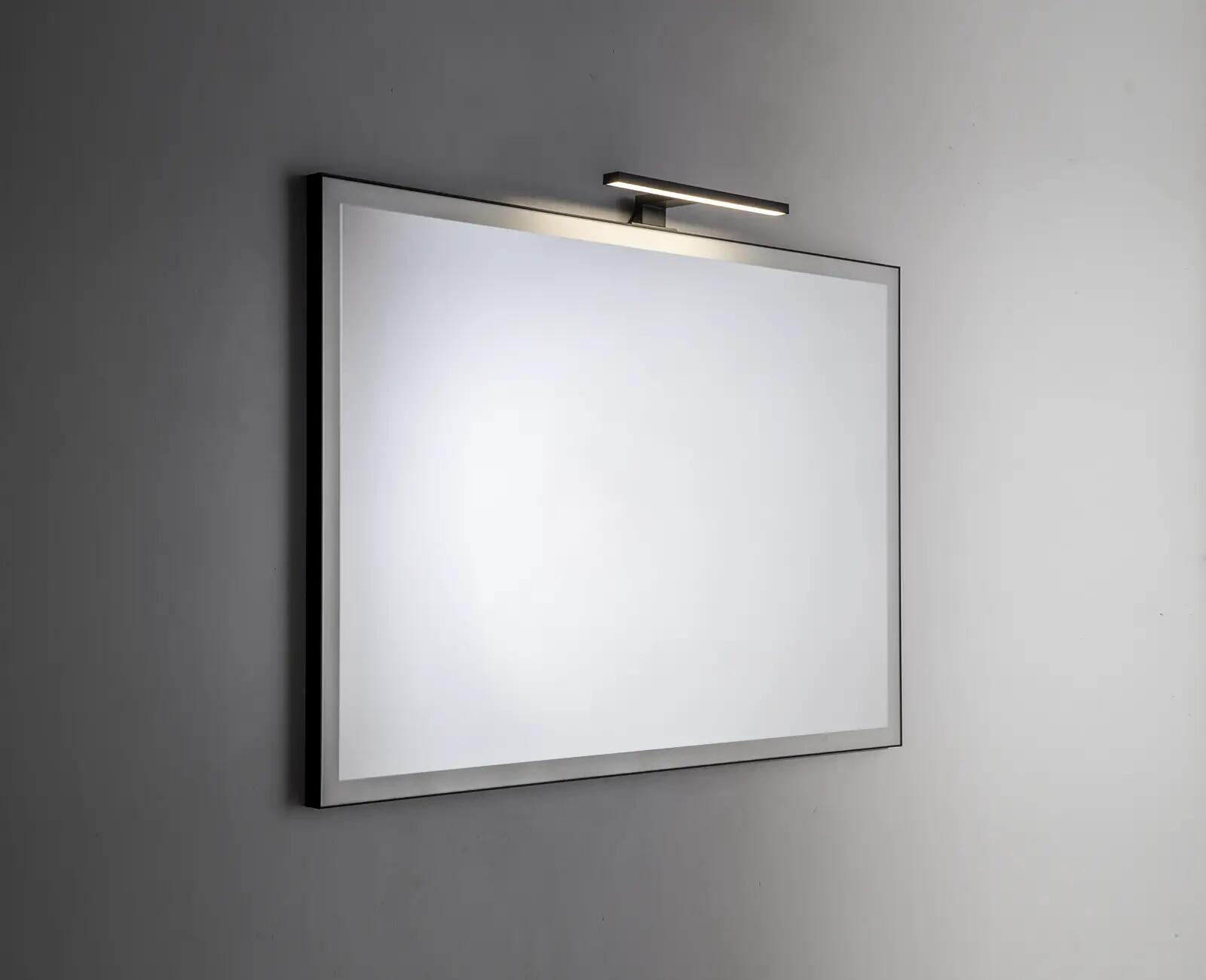 Specchio cm. 110x70 rettangolare 4 mm filo lucido con cornice nera, sabbiatura perimetrale 1 cm. su fronte specchio, lampada LED nera e sensore laterale su cornice a DX. SUPERFICIE RIFLETTENTE (SPECCHIO). ILLUMINAZIONE AMBIENTALE. LINEE SEMPLICI E PULITE ABBINABILI A QUALSIASI STILE. RISPARMIO ENERGETICO. MATERIALI DI OTTIMA QUALITA'