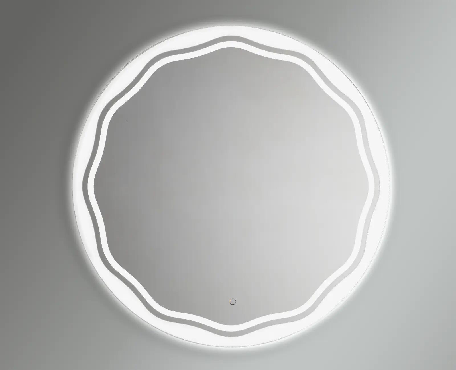 Specchio circolare con sabbiatura sagomata retroilluminata LED. L'illuminazione LED frontale è utile per il make-up e la cura del viso mentre la luce retrostante si diffonde illuminando l'ambiente circostante. L'accensione della luce avviene mediante un interruttore touch frontale inoltre grazie alla tecnologia LED utilizzata per l'illuminazione si riduce al minimo il consumo energetico.. Specchio. Luce. Superficie riflettente. Risparmio energetico. Illuminazione diretta frontale e diffusa nell'ambiente