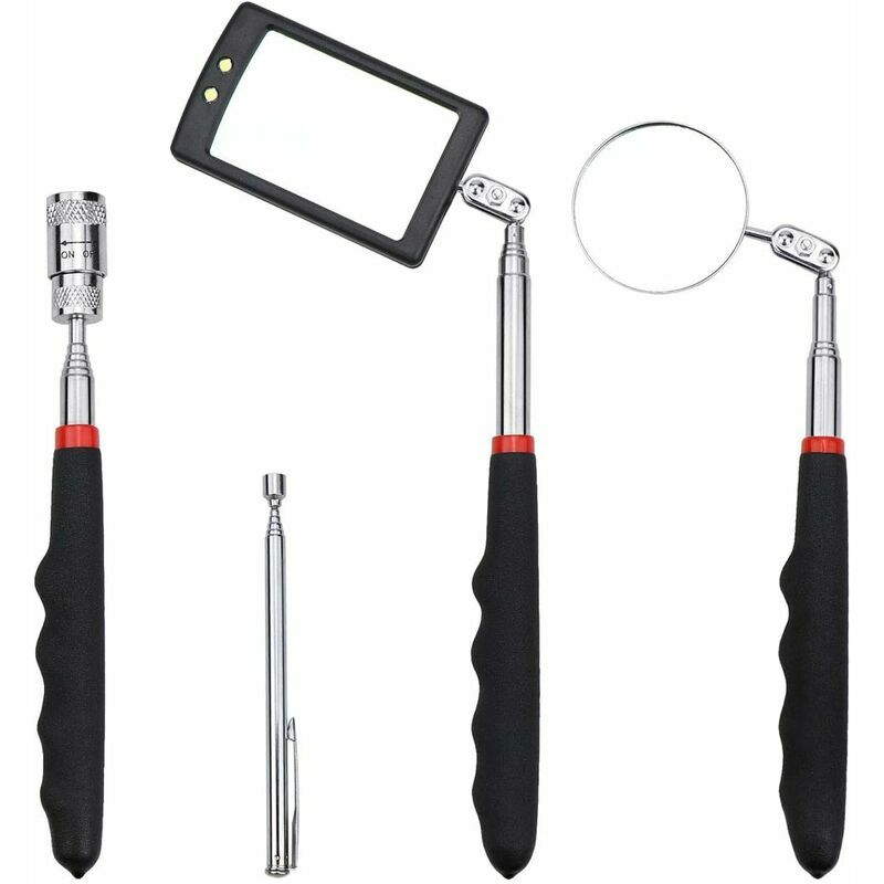 Contenuto della confezione: include 4 strumenti di raccolta magnetica per vari usi, 1 strumento di raccolta magnetica da 8 libbre (con luce LED), 1 strumento di raccolta magnetica da 1 libbra, 1 specchio di ispezione rotondo e 1 specchio di ispezione quadrato con LED leggero.< br> 【Manico telescopico & 】 Quattro strumenti di raccolta hanno sezioni telescopiche, puoi regolare la lunghezza desiderata e il design girevole a 360 gradi può essere posizionato a qualsiasi angolazione per sbirciare facilmente in quelle aree difficili da vedere e da raggiungere. br/ > 【Con luce a LED】 Lo strumento di raccolta da 8 libbre e lo specchio di ispezione quadrato sono dotati di luci a LED, molto convenienti per trovare o raccogliere perdite, crepe, strumenti persi nello spazio buio o ristretto. 【Forte magnete】 Lo strumento di prelievo magnetico ha una capacità di raccolta magnetica di 8 libbre (circa 3,63 kg). è abbastanza forte da contenere piccole parti metalliche e non oscilla quando viene