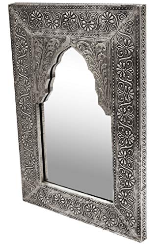 Specchio da parete orientato a specchio Malik alto 42 cm in argento| Grande specchio sala marocchina con cornice orientale decorata in legno | Specchio del bagno vintage orientale come decorazione
