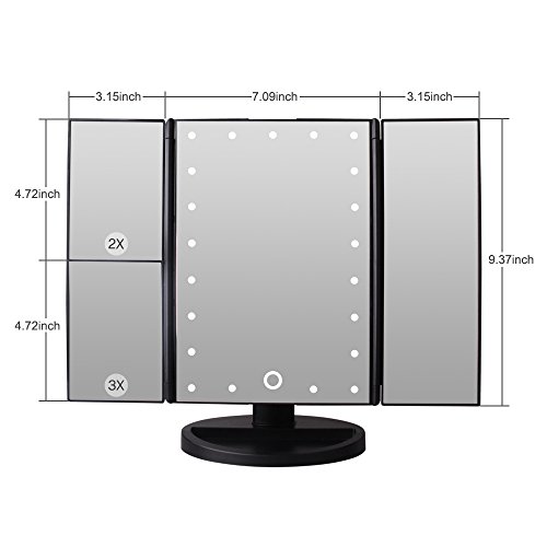 Specchio Trucco Ingradimento 1X / 2X / 3X, Specchio Triplicare Pieghevole a Tre Facce, Specchio Illuminato con 21 LED USB 180 Gradi Girevole, Ideale per Viaggio, Lavoro, Trucco, Rasatura, Colore Nero