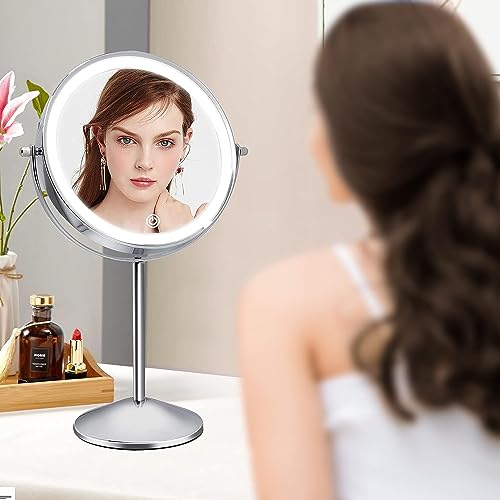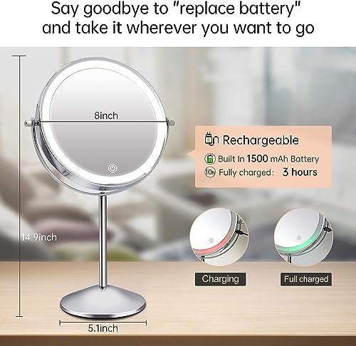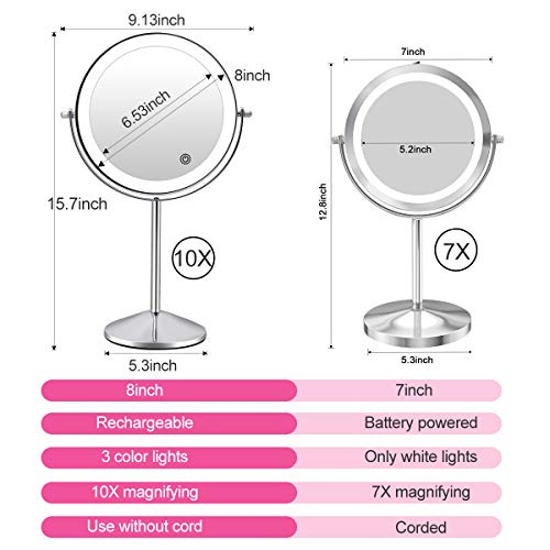 Specchio Trucco Ricaricabile Illuminato con 3 Luci Colorate, con Ingrandimento 1x/10x, Specchio da Trucco, Specchio Wireless da Tavolo