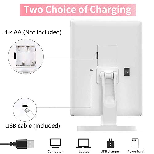 【Pratica doppia alimentazione】: 4 batterie AA (non incluse) e il cavo di alimentazione USB (incluso) possono alimentare lo specchio cosmetico illuminato. Si prega di non utilizzare la ricarica USB e la batteria per alimentarlo contemporaneamente e lo specchio stesso non può immagazzinare energia.