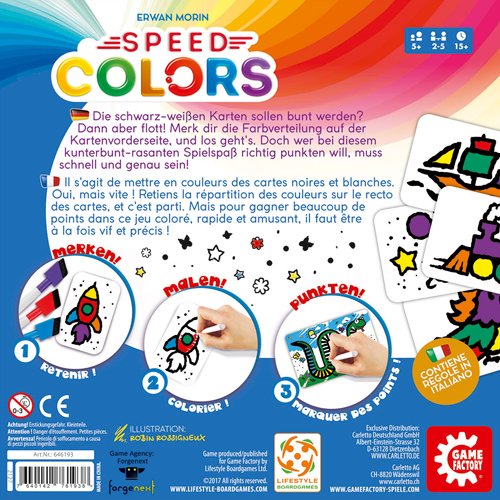 I biglietti in bianco e nero devono essere colorati? Allora allora allora flott! Merk dir die Farbverteilung auf der Kartenvorderseite, und los geht's. Ma chi vuole puntare correttamente in questo gioco colorato deve essere veloce e preciso. I biglietti sono lavabili e vengono così utilizzati più volte. Combinabile con la confezione "Speed Colors Booster Pack", che contiene 6 penne di ricambio e altre schede per foto.