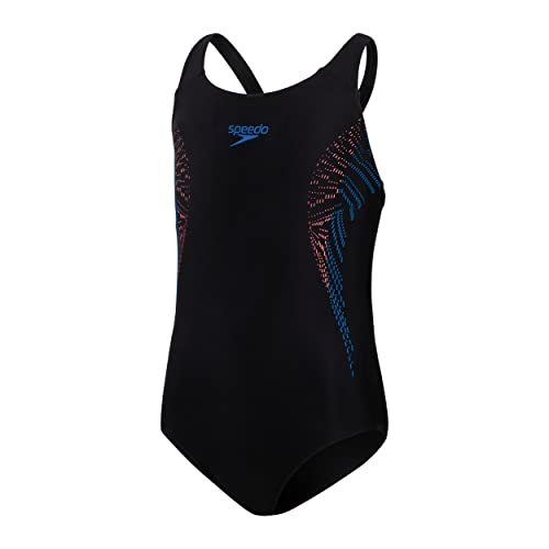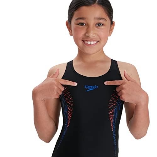 Speedo Bambina Plastisol Placement Muscleback Costume intero, Nero/Sirena Rosso/Blu Fiamma, 9-10 Anni