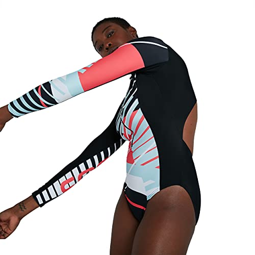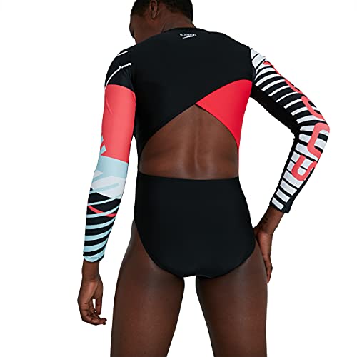 Speedo Placement Long Sleeve Wrap Back 1, One Piece Swimsuit Donna, Nero(nero/Bianco/Sky/Lava Red), 38 IT 48