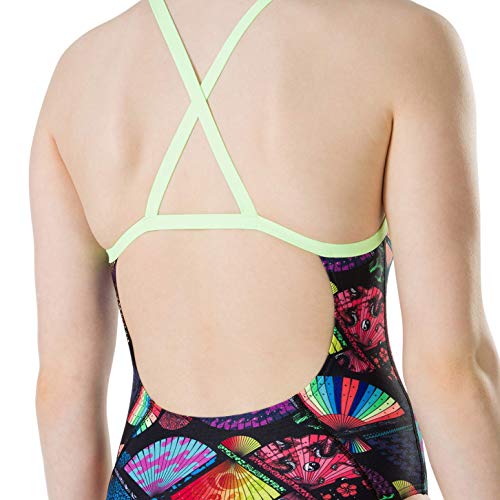 Speedo Tranq Fan Allover digi Thinstrap Crossback, Badeanzug Bambina, Nero/Giallo, 32 (13-14 Anni)