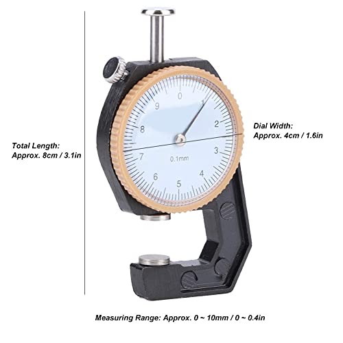 FACILE DA USARE: lo spessimetro con quadrante rotondo ha la testa piatta, testa conica di 2 tipi, può misurare lo spessore di diversi materiali separatamente e facile da usare.