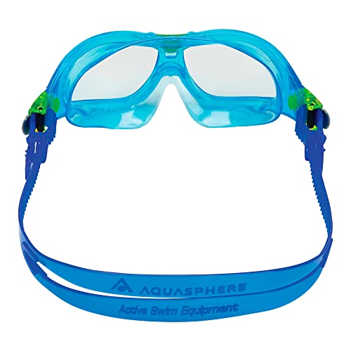 Aqua Sphere Seal Kid 2 - Occhialini da nuoto per bambini, visione subacquea, comodi, lenti antigraffio, ipoallergeniche, unisex, per bambini, lenti trasparenti, montatura turchese/blu