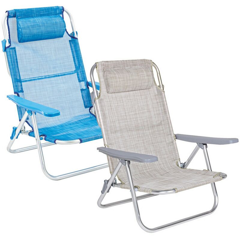 In alluminio, tubolari da ø cm 2,2. tessuto in textilene colorato. a 7 posizioni regolabili. dimensioni: cm. 62x63xh.78.telo grigio