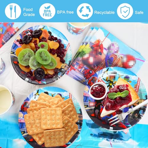 Spiderman Stoviglie per Feste Compleanno, 60PCS Spiderman Decorazione Compleanno Kit, Spidey Stoviglie per Feste Compleanno Palloncini, Striscioni, Tovaglie, Piatti, Tazze, Tovaglioli, per 10 Ospiti