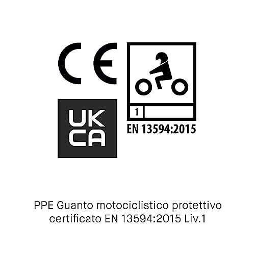 SAFETY: -Imbottiture palmo -PPE Guanto motociclistico protettivo certificato EN 13594:2015 Liv.1 -CE: abbigliamento motociclistico protettivo sotto il Regolamento (UE)2016/425 -Dichiarazione di conformità CE CODE: 77CA105B
