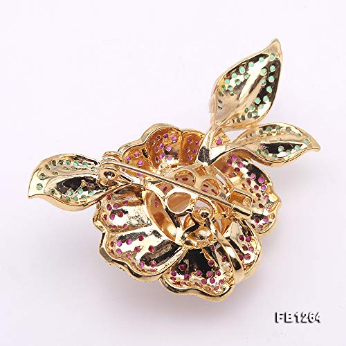 Bella spilla bianca da 8,5 mm con motivo floreale. Completamente intarsiata con zirconi lucidi, con una perla d'acqua dolce di alta qualità da 9 mm al centro.