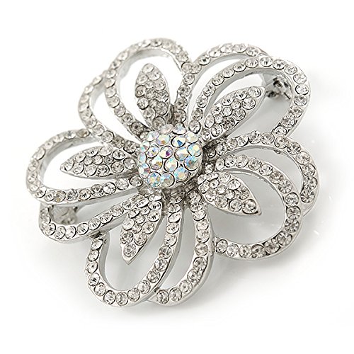 Spilla a forma di fiore con cristalli, Statement Clear & AB Austrian, placcata in rodio, 40 mm di diametro