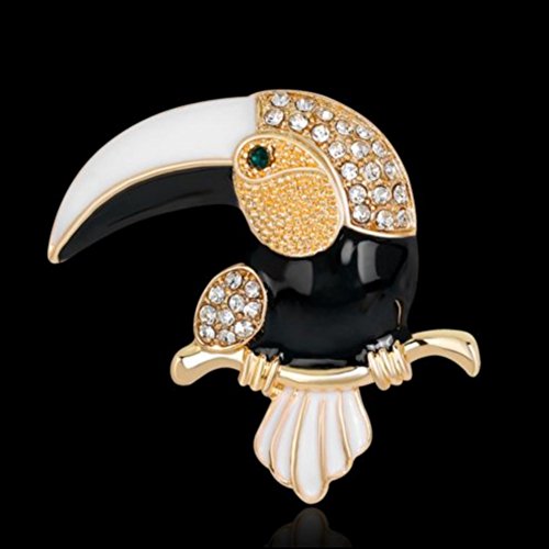 Spilla a forma di pappagallo dorato e nero con strass bianchi.