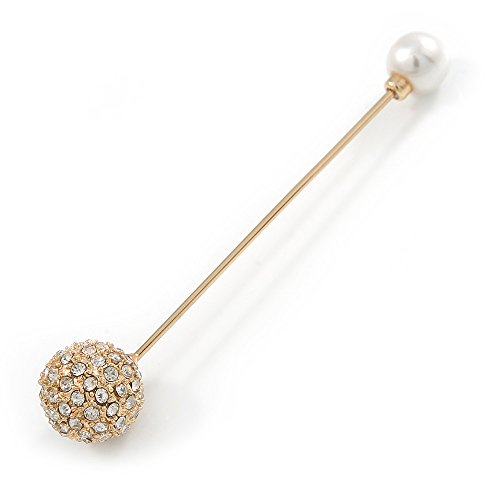 Spilla metallica a bastoncino con perla e sfera di cristalli, di ispirazione vintage, per risvolti, cappelli, gessati, smoking, colletti, sciarpe e cappotti, lunghezza 85 mm, colore: argento