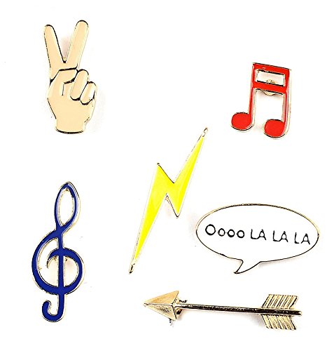 Spilla, spilla in metallo, set da 6 pezzi, motivi: nota musicale, freccia, saetta, mano