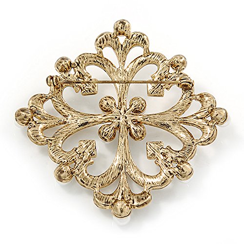 Spilla con perla di vetro, In stile vittoriano, In filigrana di cristallo trasparente, Color oro anticato, Lunghezza: 63 mm