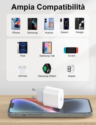Spina Caricatore USB C 20W per Apple iPhone 14 13 12 11 Samsung S23 S22 S21 A53, Google Pixel, Huawei, Xiaomi, iPad Presa Alimentatore Caricabatterie Rapido Universale Multiporta Spinotto