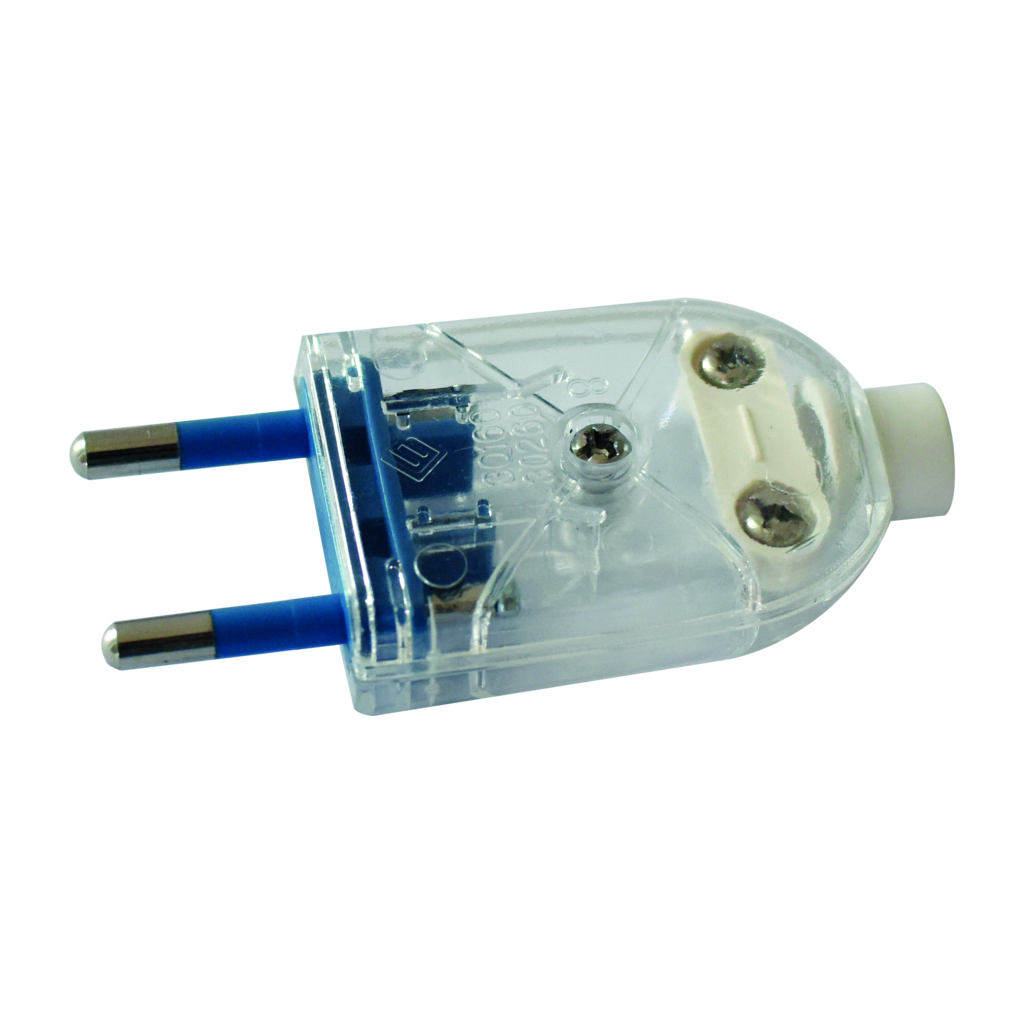 Spina 10A 2P, uscita cavo assiale, fermacavo isolante a vite, IMQ trasparente