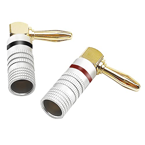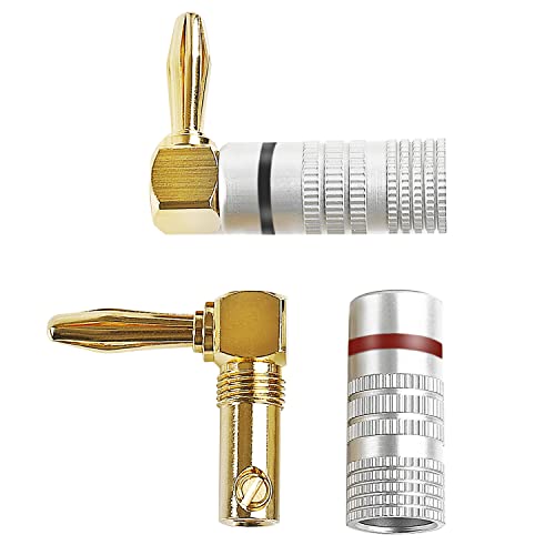 4 spine per cavo a banana placcati oro 24 K a 90 gradi, connettore jack audio ad angolo retto, chiusura a doppia vite, connettore per cavo per amplificatore, HiFi, ricevitore (2 neri e 2 rossi)
