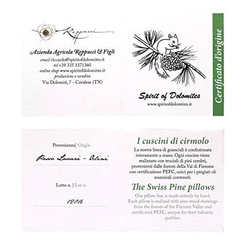 Prodotto artigianalmente in Trentino esclusivamente con trucioli di pini cembri certificati, provenienti dalle foreste della Val di Fiemme