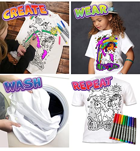 COLORE—>INDOSSARE—>LAVARE-->COLORE ANCORA: I bambini possono colorare magliette, tovaglie, astucci, borse di tela, cuscini e molto altro ancora e ancora. Una volta lavati, i colori spariranno magicamente pronti per essere nuovamente colorati!