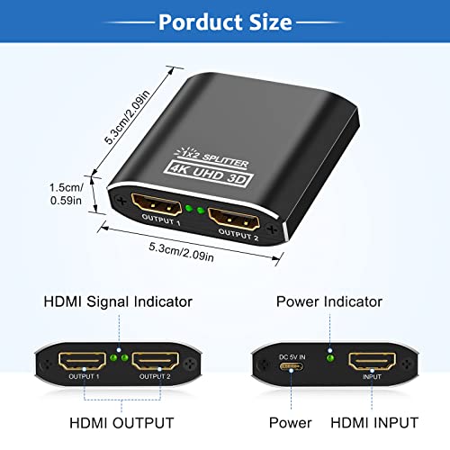 HDMI Splitter 4K, Alluminio Sdoppiatore HDMI Automatico 1 Ingresso 2 Uscite, Duplicatore HDMI Supporta 4K 3D e 1080P, per Blu-Ray Lettore, HDTV, Lettore di Rete, PS3/4, XBox, Digital STB, ecc