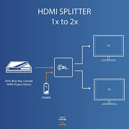 Uso: Questo splitter CSL HDMI a 2 porte consente di trasmettere il segnale da un lettore HDMI come PC, notebook, media center, ricevitore TV, ricevitore AV, lettore Blu-ray o console di gioco a due dispositivi di visualizzazione (TV, monitor, proiettore) contemporaneamente. Lo splitter 4K-HDMI consente la distribuzione di un segnale HDMI fino a due terminali.