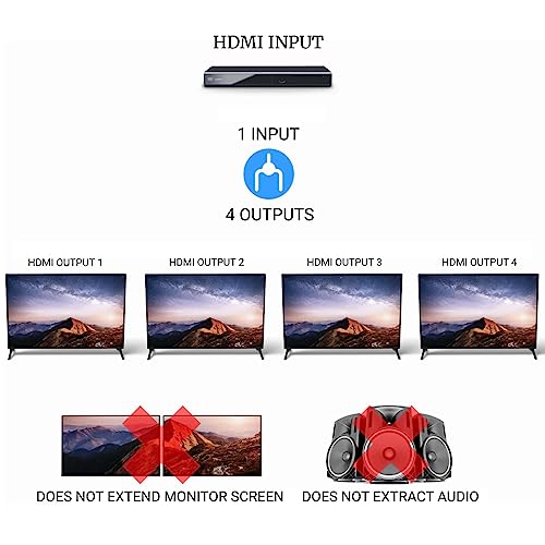 【Trasmissione a lunga distanza】 Lo splitter 1x 4 HDMI fornisce una distanza extra lunga per la trasmissione video / audio, fino a 100 piedi (ingresso 40 piedi, uscita 60 piedi) con il cavo standard HDMI AWG26. Consentono di duplicare facilmente lo schermo in stanze diverse.