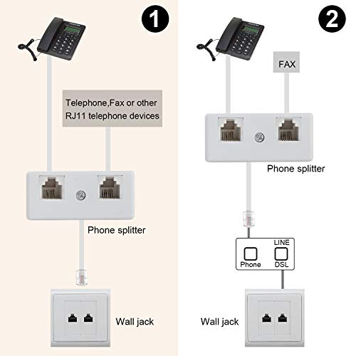 【Facile da usare】Lo splitter per telefono a due vie è molto semplice da usare. Collegare l'adattatore alla presa telefonica RJ11 e collegare i cavi RJ11 (non in dotazione) all'adattatore.