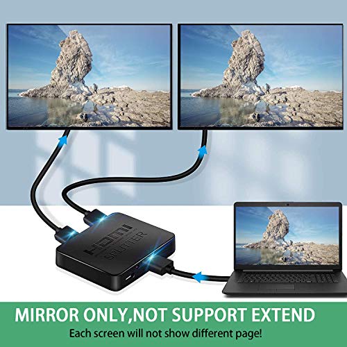 【2 stesse uscite vengono visualizzate contemporaneamente - Solo specchio, non esteso - Lo splitter HDMI alimentato può distribuire un segnale di ingresso HDMI a due display HDMI, trasmettere video e audio contemporaneamente, nessuna perdita, nessun ritardo (NOTA: questo splitter HDMI 4K non estende i monitor, solo per duplicarli) (l'unità viene fornita con un cavo USB-micro USB , ma non viene fornita con una fonte di alimentazione da 110 V).
