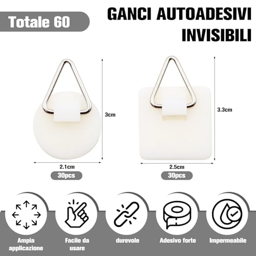 【Contenuto della confezione】Riceverai 60 ganci adesivi invisibili (30 rotondi e 30 quadrati), sufficienti per l'uso quotidiano e la sostituzione. La dimensione del gancio quadrato è 2,5*2,5 cm e la dimensione del gancio rotondo è 2,1 *2,1 cm.