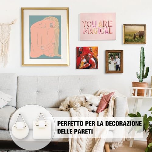 【Gancio nascosto, risparmia spazio】Il gancio per appendere quadri è piccolo, leggero e facile da riporre. I ganci per quadri resistenti hanno un robusto supporto autoadesivo che aderisce saldamente a piatti o decorazioni, senza lasciare traccia del gancio visibile sul muro, conferendogli un tocco artistico.