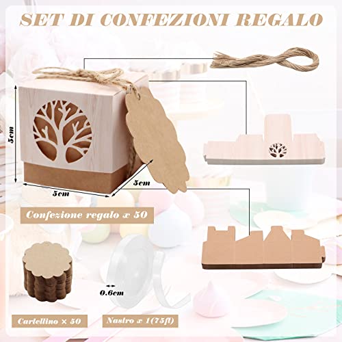 SPOKKI 50 Pezzi Scatoline Bomboniere, Albero della Vita, Kraft Paper Scatoline Portaconfetti con Etichette, Corda di Canapa, Nastro per Comunione, Matrimonio, Battesimo, Laurea, Cresima di Nascita