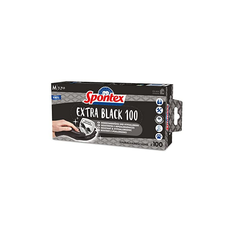Confezione da 100 guanti monouso in vinile senza polvere per mano sinistra e destra Extra resistente e molto comodo da indossare Colore nero alla moda per un'impressione pulita Particolarmente delicato sulla pelle: ipoallergenico L'Extra Black 100 è un guanto monouso